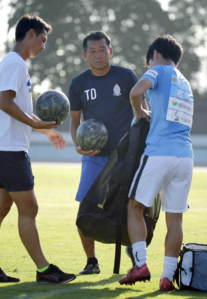 選手と一緒にボールを片付ける(C)日刊ゲンダイ