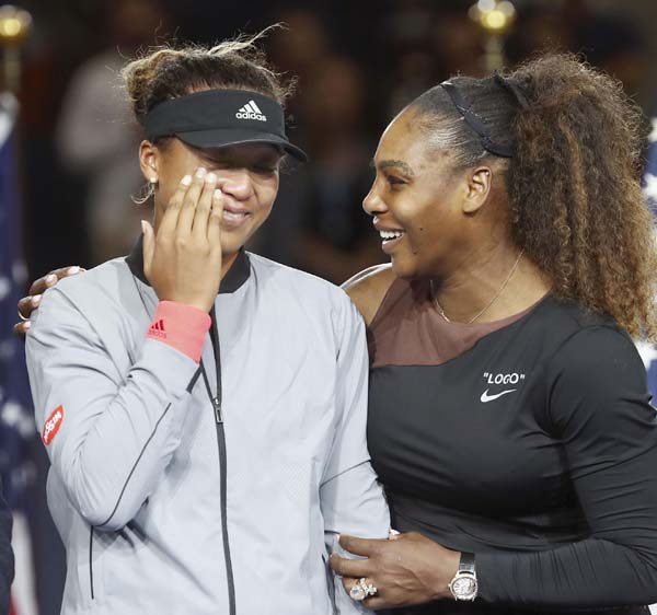優勝スピーチの前にセリーナに肩を抱かれる大坂なおみ(ゲッティ=共同)