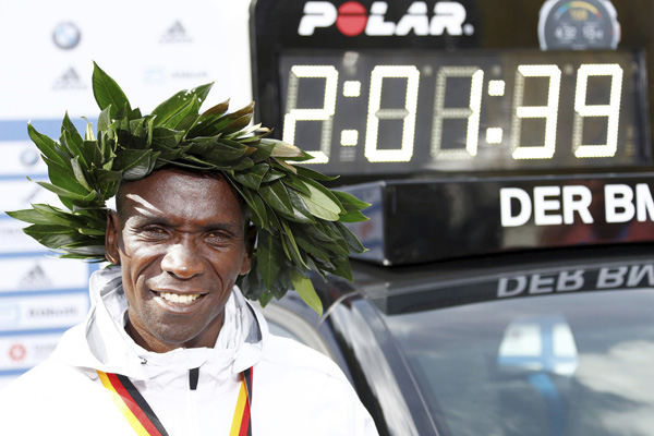 世界記録で連覇を達成したエリウド・キプチョゲ(ロイター=共同)