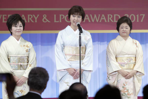 昨年暮れの創立50周年記念パーティーで挨拶する小林浩美会長(中央)。この時、すでに主催者との火種はくすぶっていた(C)日刊ゲンダイ