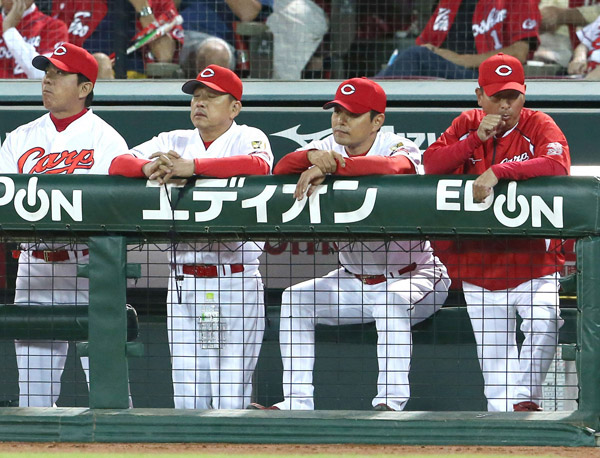 ベンチは常に目を光らせている(右から2番目が緒方監督)(C)日刊ゲンダイ