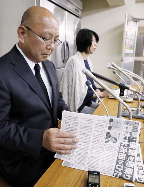 記者会見で週刊誌の記事のコピーを手にする日大水泳部の上野広治監督(C)共同通信社