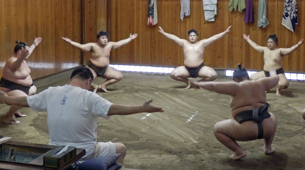 慣れない新環境の中で(手前は千賀ノ浦親方)/(C)共同通信社
