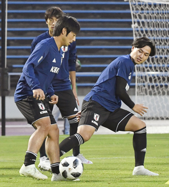 10日の練習後にMF南野(右)は「自分の良さを出して勝ち残っていきたい」とヤル気満々だ(C)共同通信社