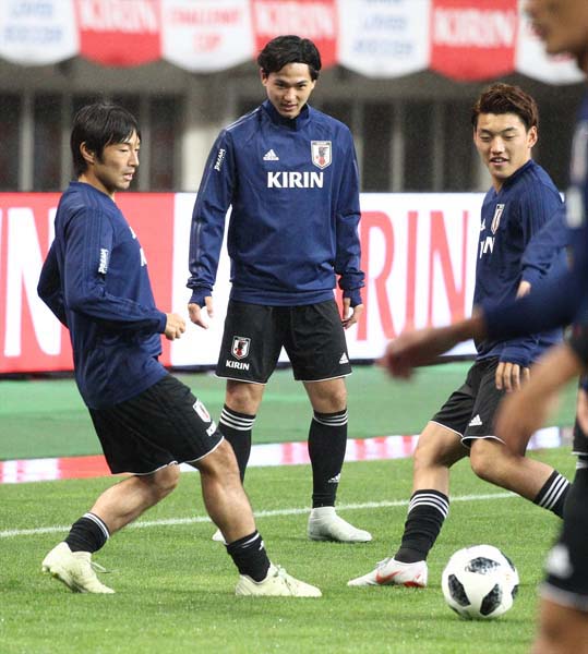 雨中の練習(11日)でMF南野(中)はMF中島(左)、MF堂安(右)とリラックスしながらボール回し(C)Norio ROKUKAWA/office La Strada