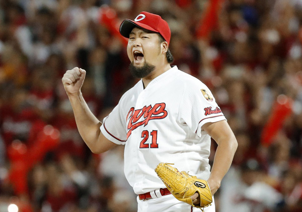 リーグ優勝を決め、ガッツポーズをする広島・中崎(C)共同通信社