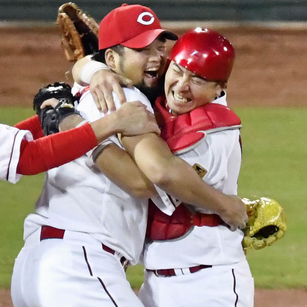 リーグV3の立役者でもある会沢(右)/(C)共同通信社
