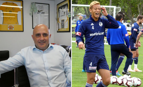 本田は練習中に笑顔を見せることも(左は代理人のルー・スティッカ氏)/(撮影)元川悦子
