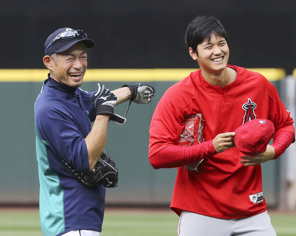 イチローと談笑する大谷(C)共同通信社
