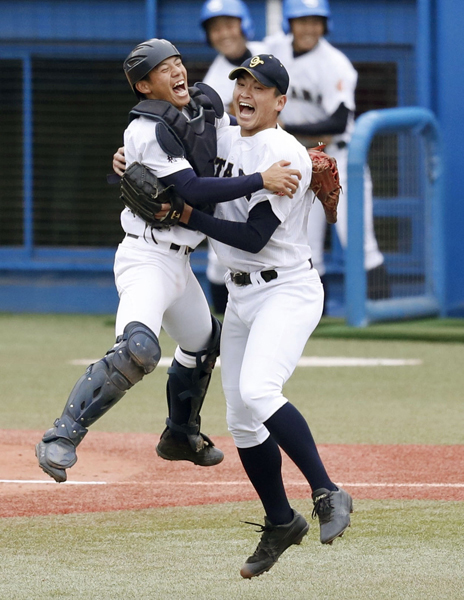 完投勝利に喜ぶ西原投手(右)/(C)共同通信社