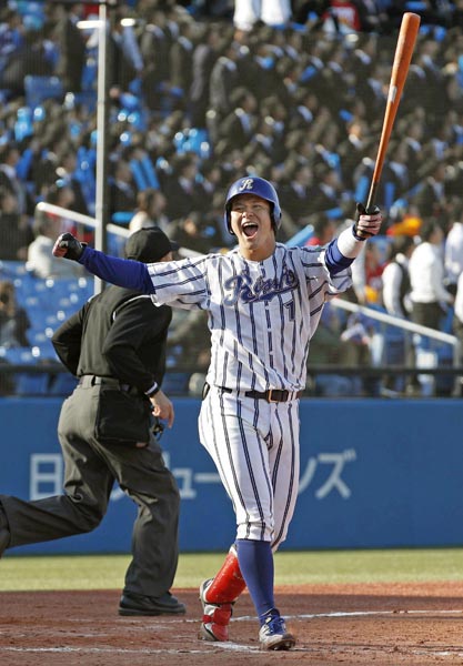 八回に逆転弾を放つ伊藤裕(C)共同通信社