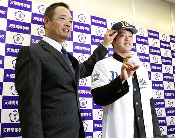 オリックスから1位指名を受け、父暁さん(左)とポーズ(C)共同通信社