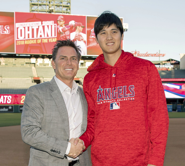 新人王に選出され、代理人のネズ・バレロ氏と握手する大谷(C)共同通信社