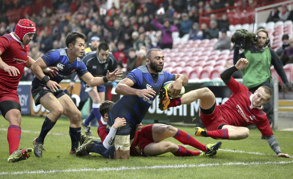 日本─ロシア戦後半、勝ち越しトライを決めるリーチ(C)共同通信社