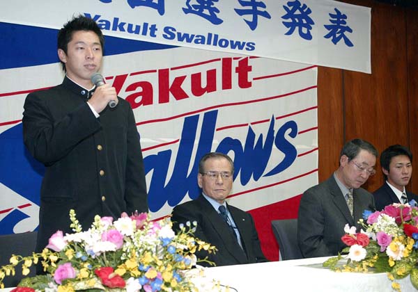 ヤクルト新入団選手発表での筆者(C)日刊ゲンダイ