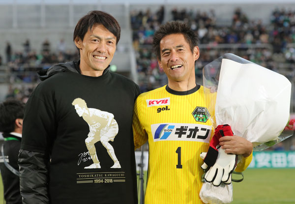 鹿児島戦後の引退セレモニーで名古屋GK楢崎(左)がサプライズで登場した(C)Norio ROKUKAWA/office La Strada