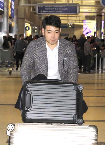 日本時間の17日、ロサンゼルス空港に到着した菊池(C)共同通信社