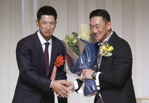 金本監督(右)の野球殿堂入りを祝う会での矢野監督(C)共同通信社