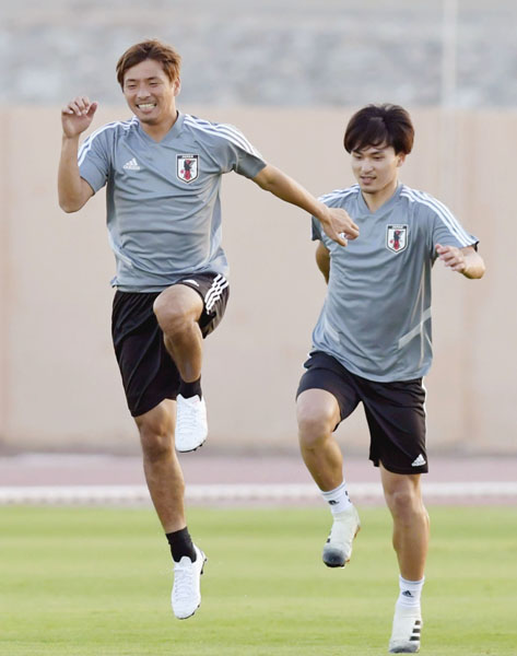 現地で練習するMF乾(左)とMF南野(C)共同通信社