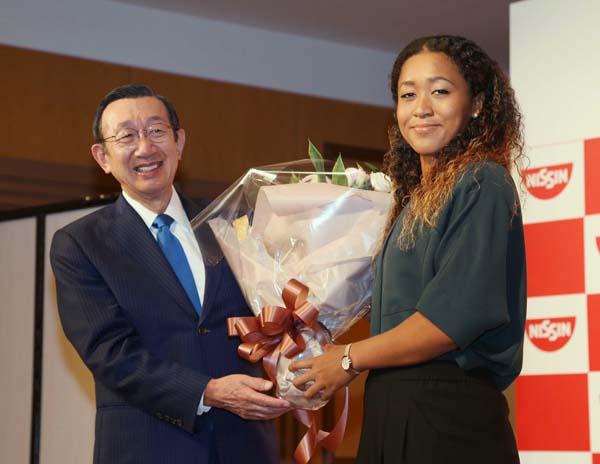 日清食品HDの安藤宏基社長(左)と大坂なおみ(C)日刊ゲンダイ