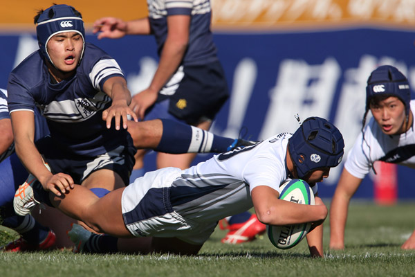 大阪桐蔭(大阪)vs桐蔭学園(神奈川) 前半13分にトライを決めた大阪桐蔭の嘉納選手(C)日刊ゲンダイ