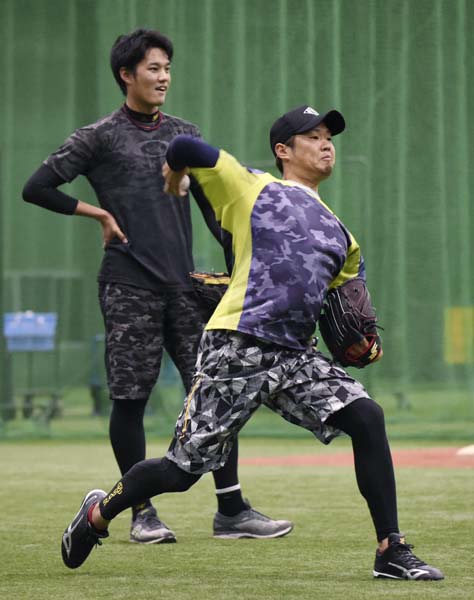 西(手前)らとトレーニングした藤浪(C)共同通信社