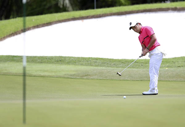 SMBCシンガポールOPでピンを差したままパットする比嘉一貴(C)共同通信社
