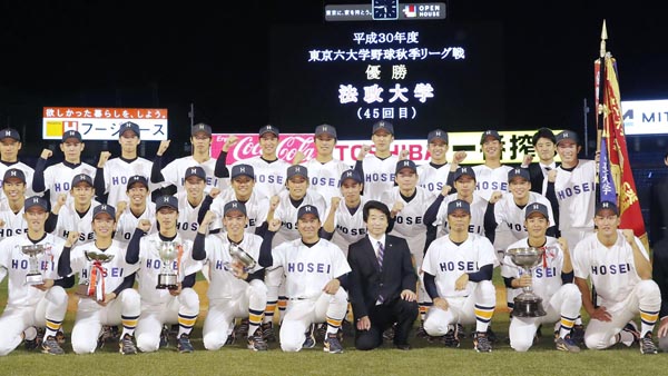 法大ナインに囲まれる青木監督(前列中央)/(C)共同通信社