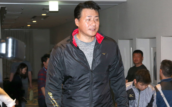 ミーティング会場を後にする与田監督(C)日刊ゲンダイ