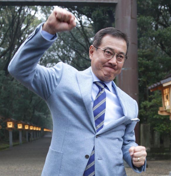 宮崎神宮参拝後にはこのガッツポーズ(C)日刊ゲンダイ