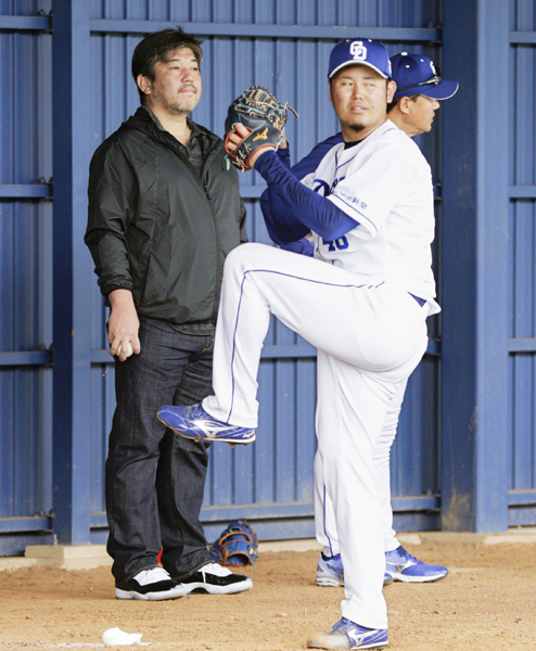 ブルペンで野茂氏(左)が見守る中、投球練習をする鈴木博(C)共同通信社