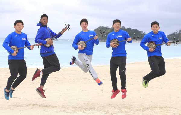 休日に三線を体験した吉田輝星(中央)/(C)日刊ゲンダイ
