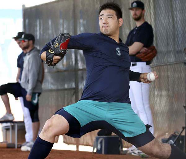 キャンプ地ピオリアのブルペンで投球練習をする菊池(C)共同通信社