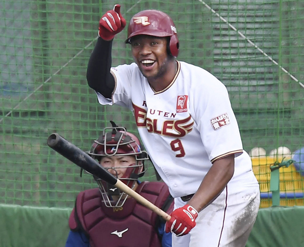 笑顔で打撃練習をするオコエ(C)共同通信社