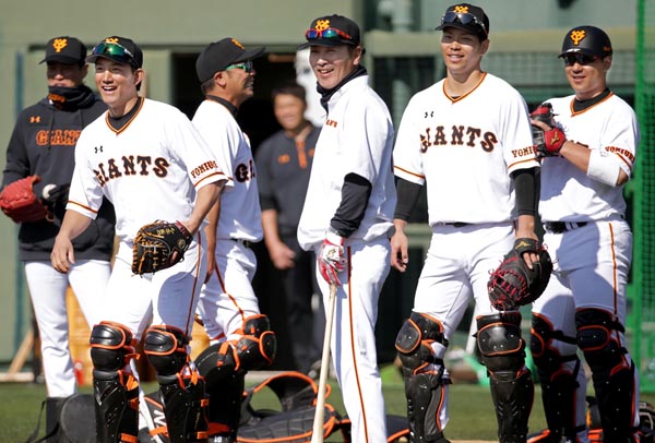 正捕手の座を4人で争う(左から小林、阿部、元木コーチ、大城、炭谷)/(C)日刊ゲンダイ