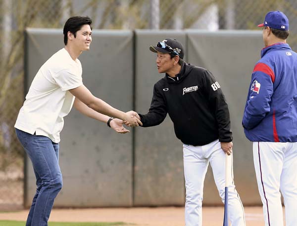 古巣のキャンプを訪問した大谷(C)共同通信社