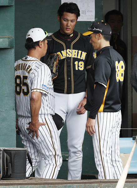矢野監督(右)、福原コーチ(左)と話す藤波/(C)共同通信社