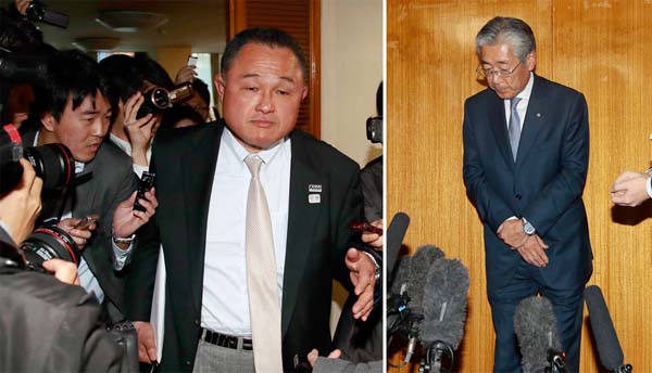 「次の理事会のメンバーが決めること」と山下氏(頭を下げる竹田氏・右)/(C)日刊ゲンダイ