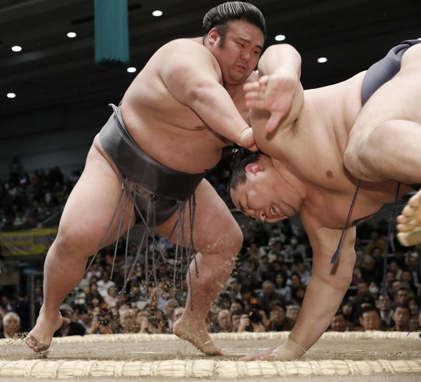 春場所10日目、貴景勝(左)が引き落としで鶴竜を破った(C)共同通信社