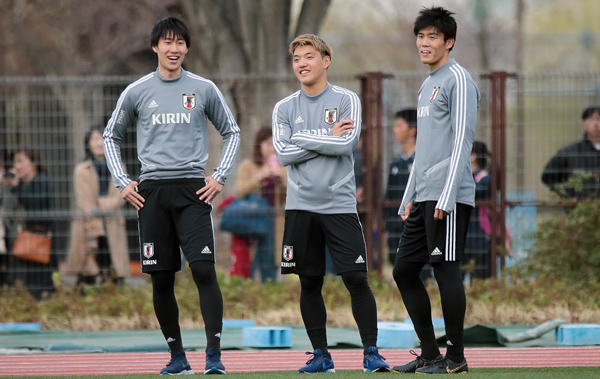 19日の代表練習で笑みを浮かべるFW鎌田(左)にMF堂安(央)とDF冨安(C)Norio ROKUKAWA/office La Strada