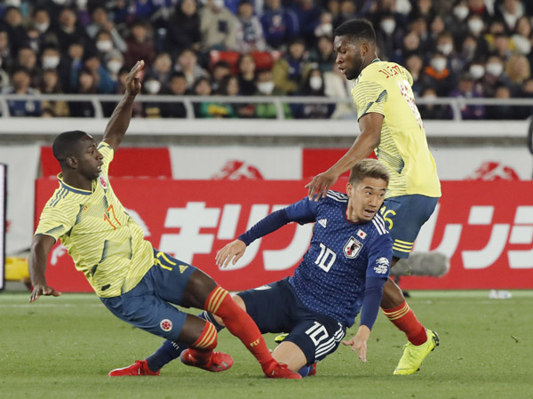 コロンビアの選手に潰されるMF香川(C)日刊ゲンダイ