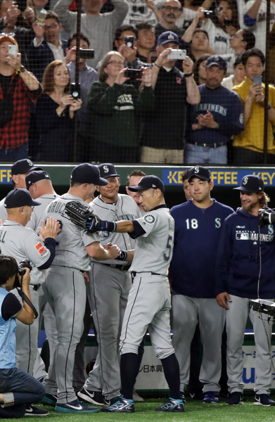 交代を告げられチームメートと握手するイチロー(C)日刊ゲンダイ