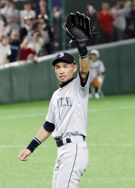 MLB日本開幕第2戦 8回に交代が告げられ大歓声に応えながらベンチに下がるイチロー(C)日刊ゲンダイ