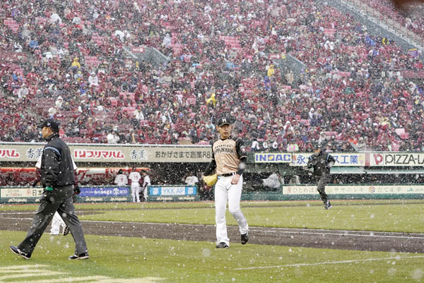 雪のため中断となり、ベンチに戻る日本ハム先発の加藤(C)共同通信社