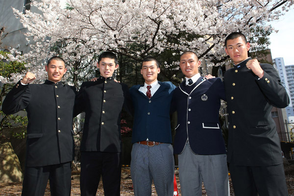 U18代表の研修合宿に参加した選手たち。左から奥山(星稜)、佐々木(大船渡)、石川(東邦)、西(創志学園)、及川(横浜)/(C)日刊ゲンダイ