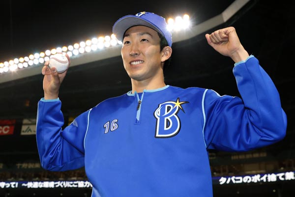阪神戦でプロ初勝利を挙げポーズをとる大貫(C)共同通信社