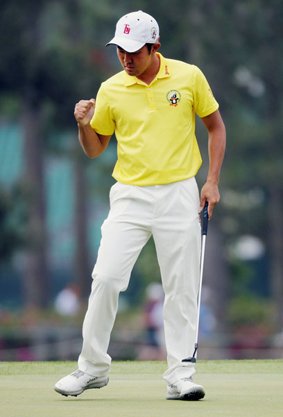 第1ラウンド、1番でバーディーを決め、ガッツポーズする金谷(C)ロイター