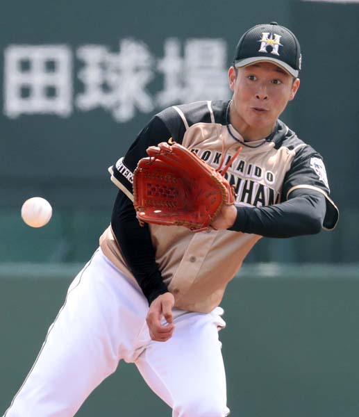 投手強襲のゴロをさばく吉田輝星(C)日刊ゲンダイ