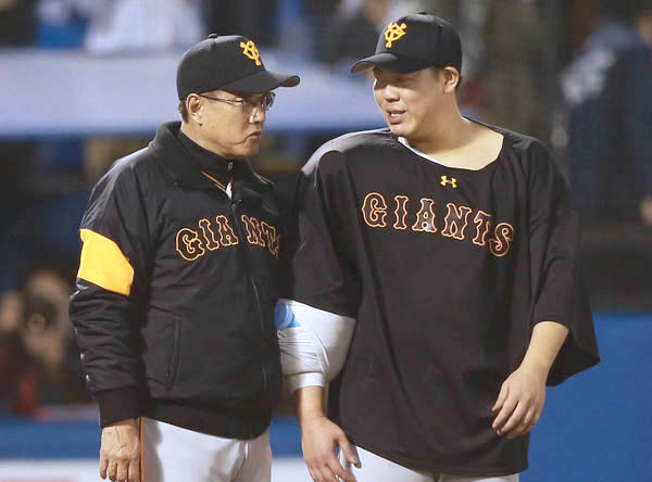 開幕4連勝で原監督(左)に声をかけられる山口(C)日刊ゲンダイ