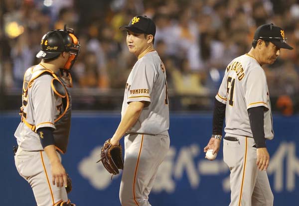 四回、宮本コーチ(右)に降板を告げられた菅野(央)/(C)日刊ゲンダイ